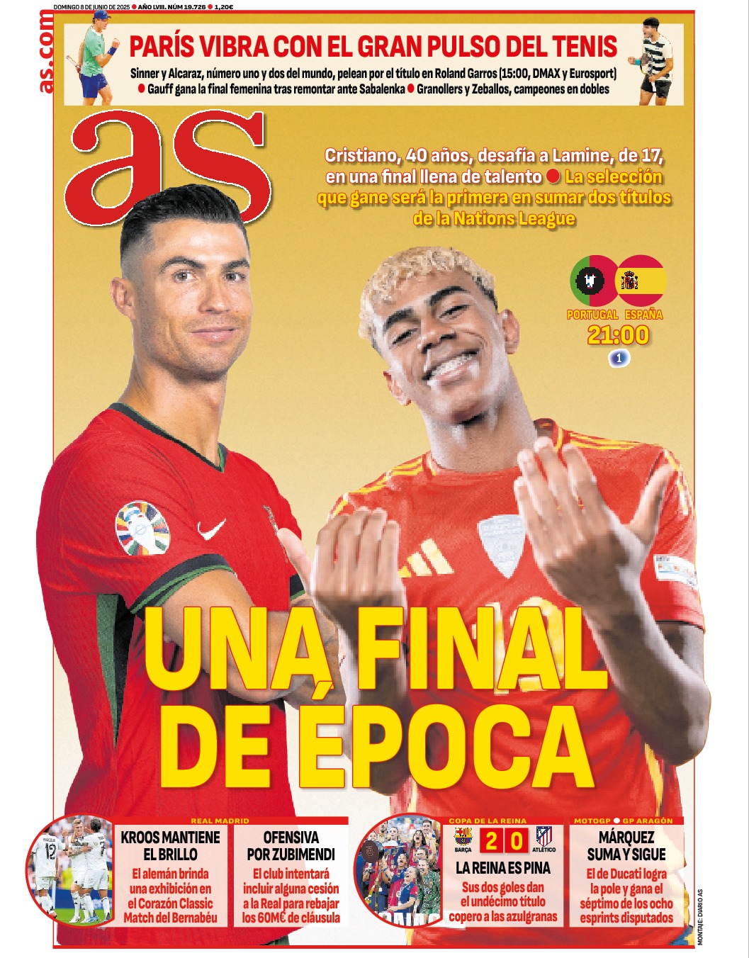 El diario AS destaca en su portada la gran final de la UEFA Nations League entre España y Portugal. Además, también hacen referencia al partido de leyendas entre Real Madrid y Borussia Dortmund.