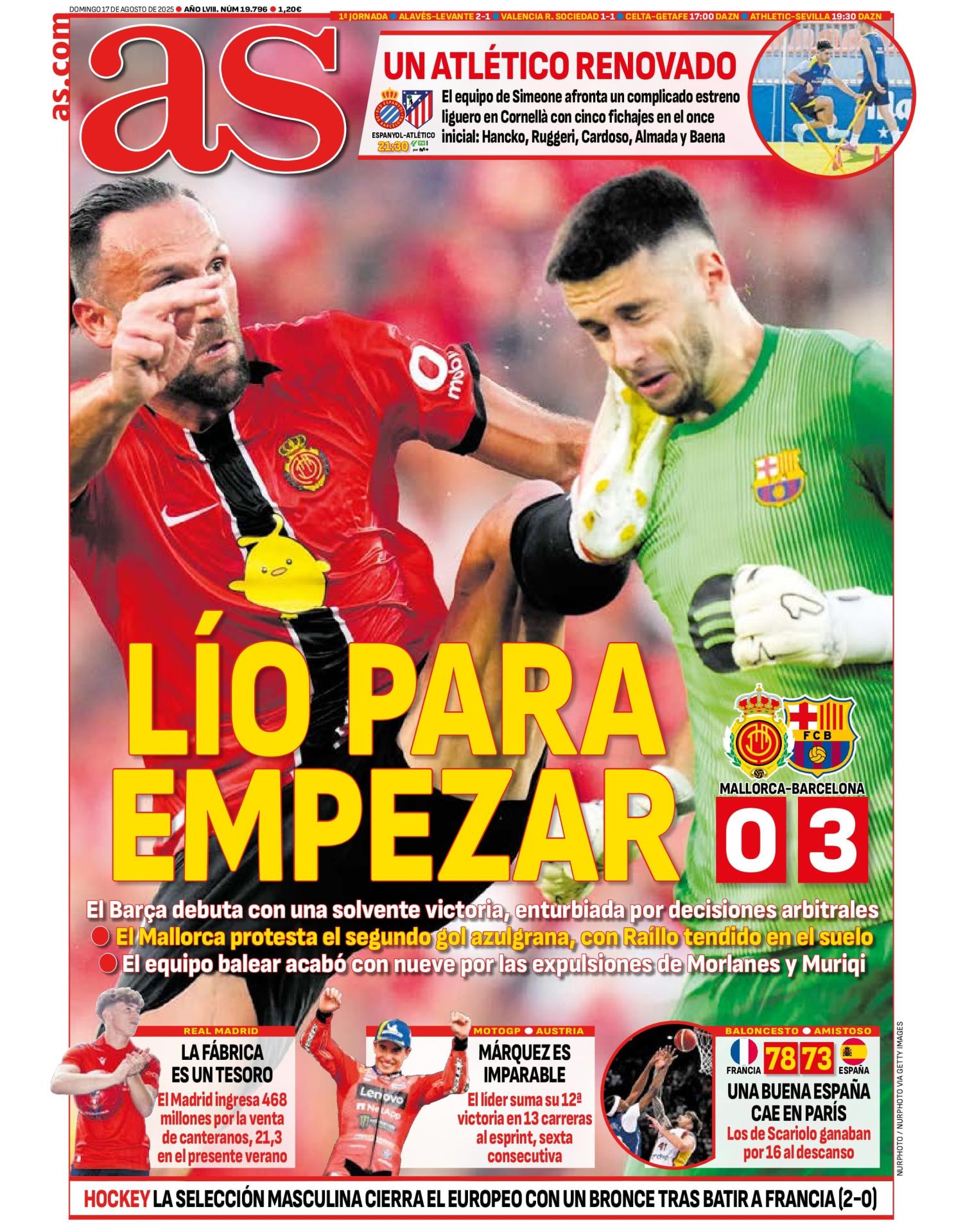 El diario AS destaca en su portada de este domingo la actuación arbitral en la victoria del Barcelona en casa del Mallorca. Los errores del colegiado favorecieron al triunfo culé que terminó ganando contra nueve futbolistas.