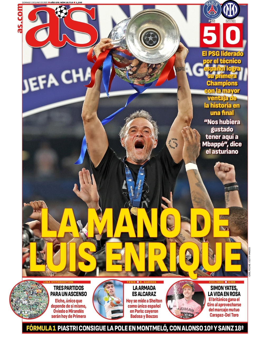 El diario AS destaca en su portada de domingo la victoria del PSG en la final de la UEFA Champions League contra el Inter de Milán donde han ganado con un contundente 5-0.