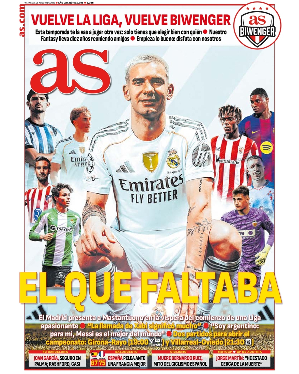 El diario AS destaca en su portada del viernes 15 de agosto la presentación de Franco Mastantuono como nuevo jugador del Real Madrid este jueves, siendo el último fichaje, presumiblemente, del club blanco.