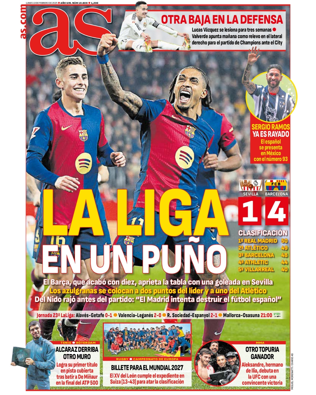 El diario as, en su portada para este lunes 10 de febrero de 2025, destaca lo apretada que está la lucha por el título de liga tras el empate en el derbi y la victoria del Barcelona ante el Sevilla.