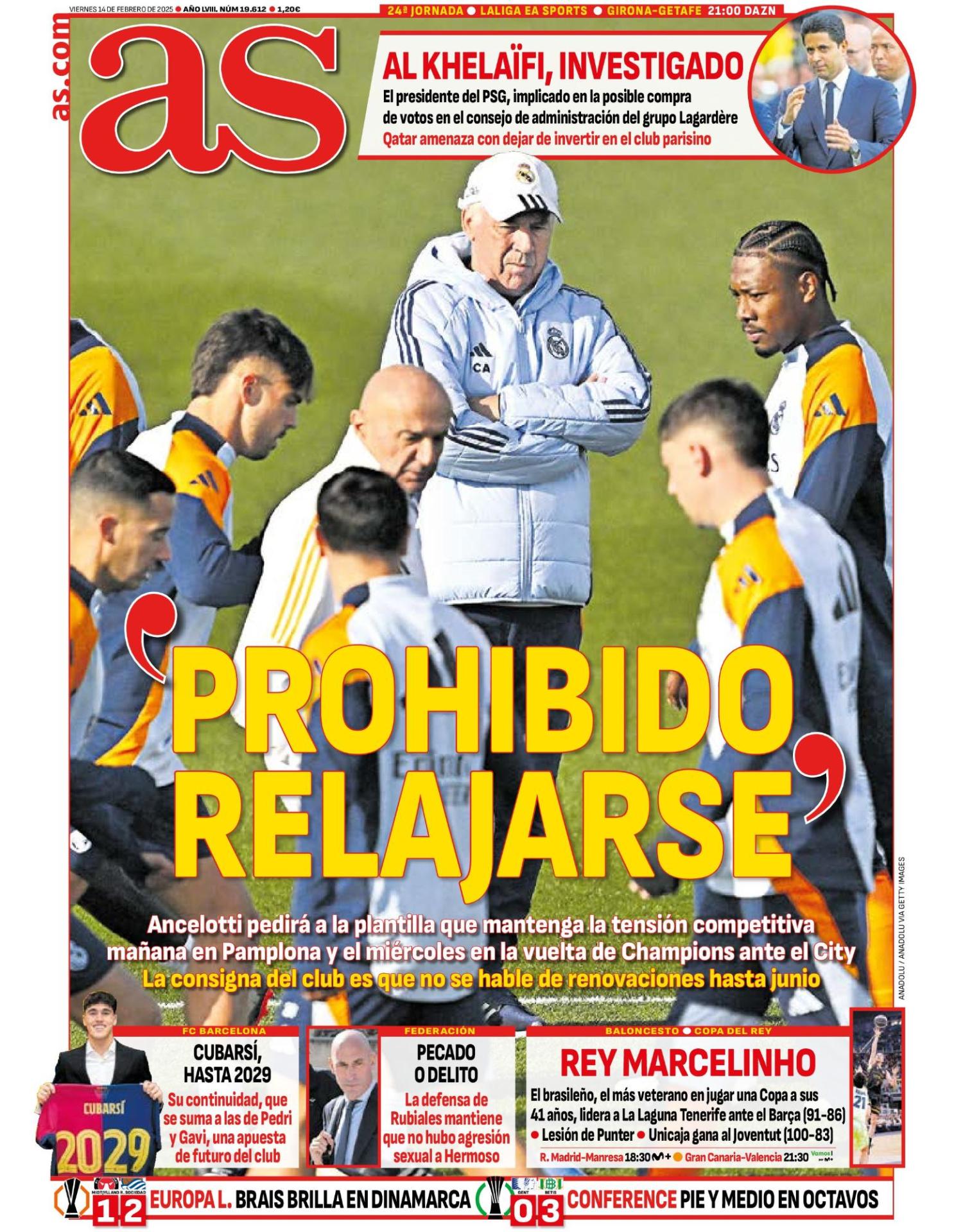 El diario as, en su portada para este viernes 14 de febrero de 2025, desvela el mensaje de Carlo Ancelotti a sus jugadores de cara a los próximos partidos ante Osasuna y Manchester City: "Prohibido relajarse".