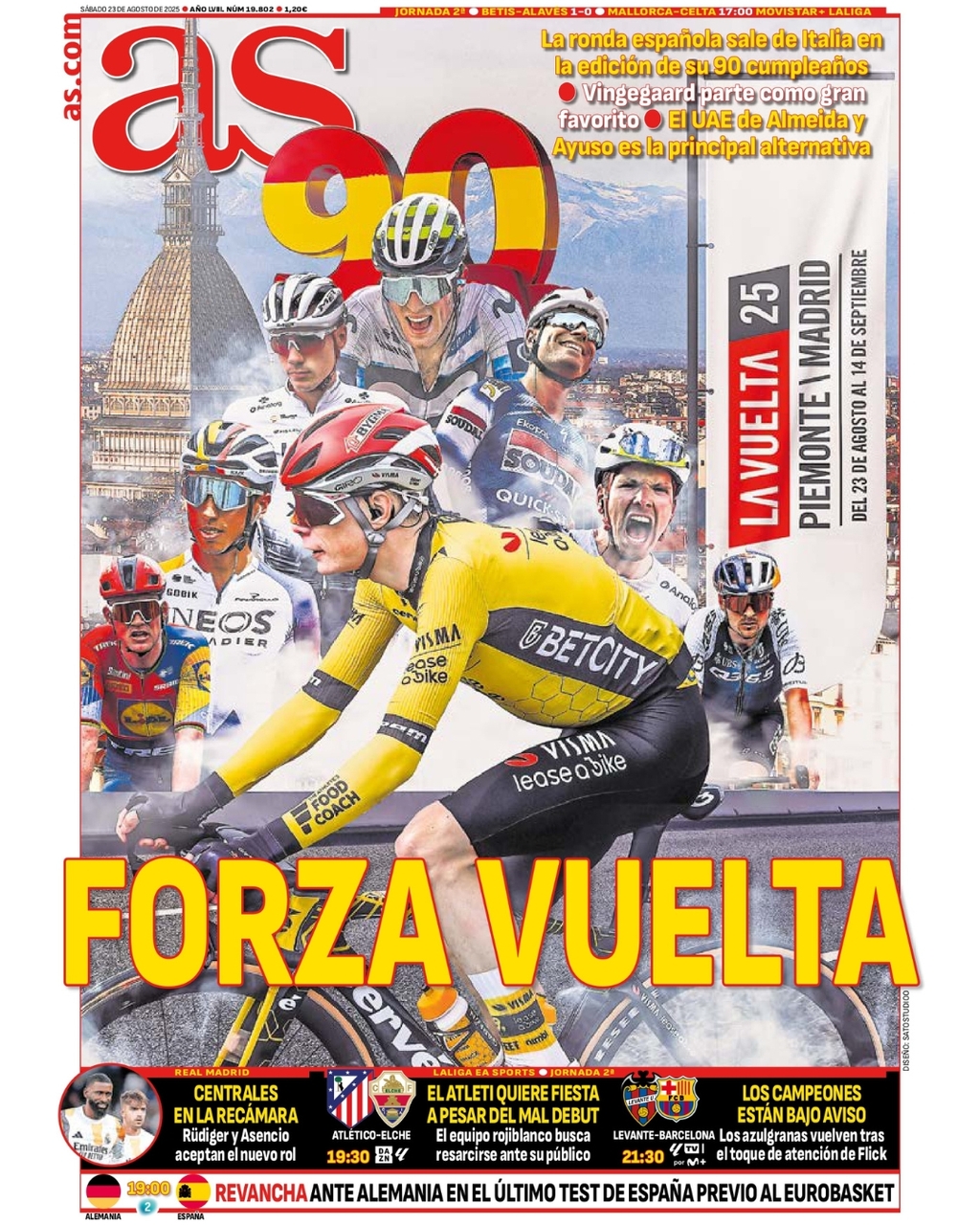 En su portada para este sábado 23 de agosto de 2025, el diario as destaca el inicio de La Vuelta a España y también resalta el nuevo rol secundario que Asencio y Rüdiger han aceptado de buen grado.