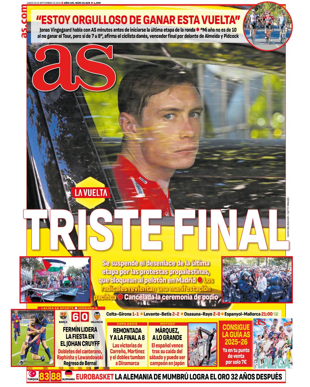 El diario as, en su portada para este lunes 15 de septiembre de 2025, destaca el "triste final" de La Vuelta España.