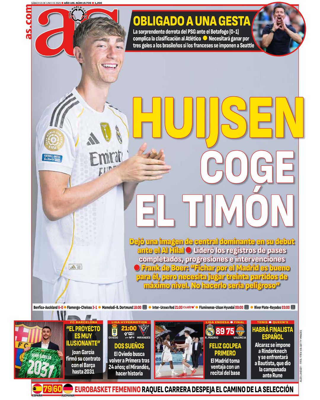 El diario AS ha sacado para su portada de este sábado 21 de junio a Dean Huijsen y su espectacular encuentro ante el Al Hilal en el debut del Real Madrid en el Mundial de Clubes frente al Al Hilal. En este sentido, lideró varios apartados en aquel partido.