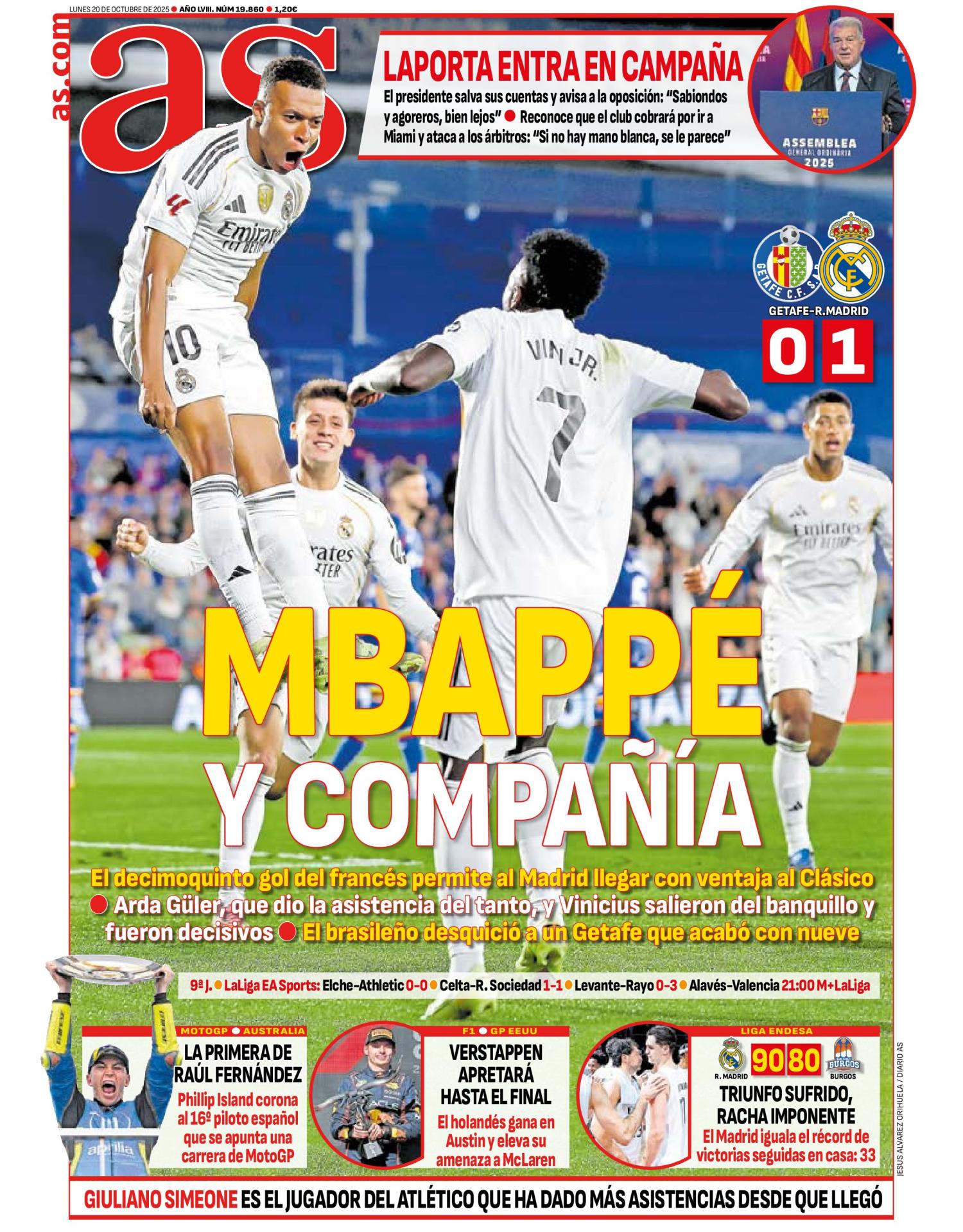 El diario AS destaca en su portada del lunes 20 de octubre a Kylian Mbappé tras el gol de la victoria que anotó en el Coliseum Alfonso Pérez para dar los tres puntos al Real Madrid antes del clásico ante el Barcelona.