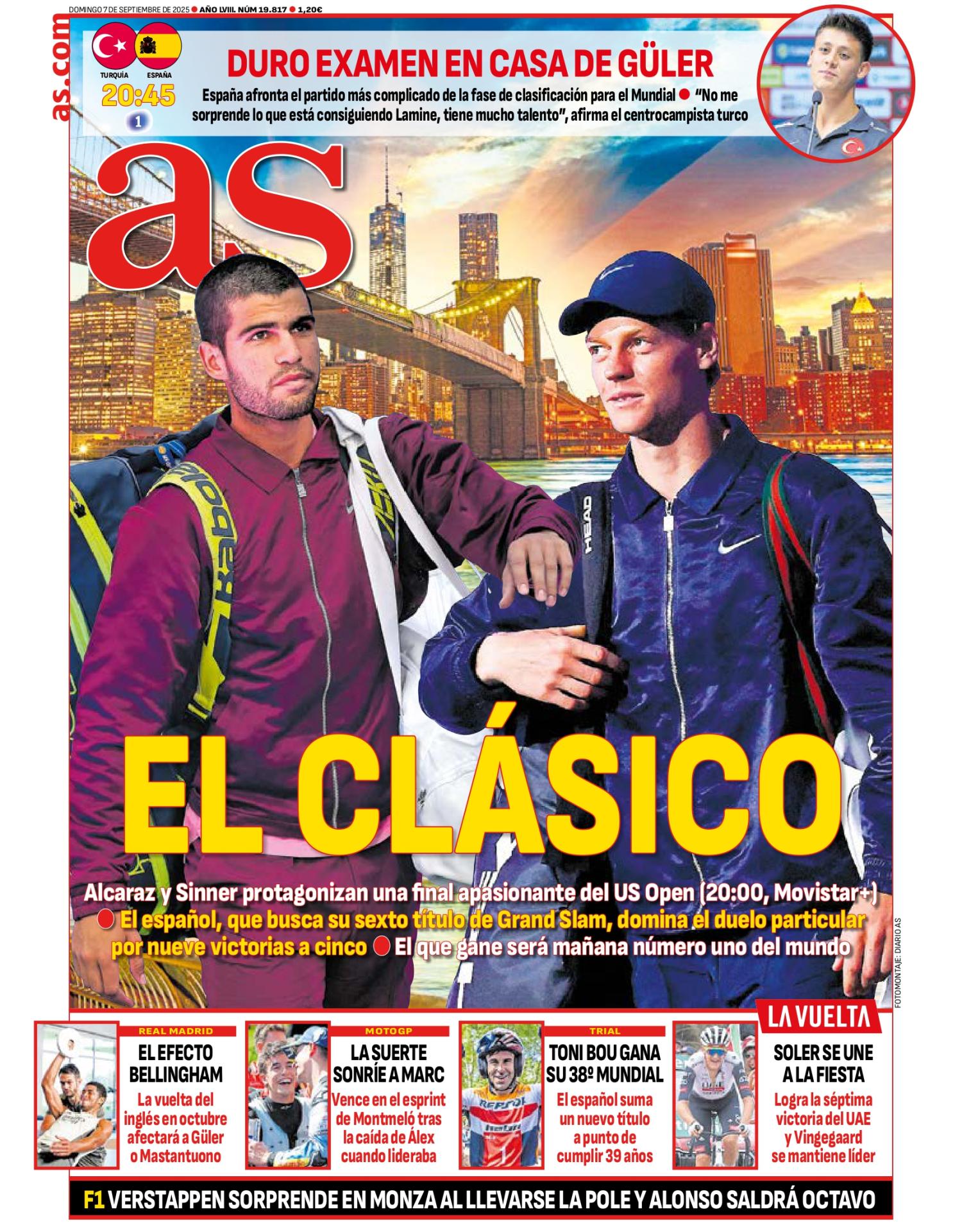 El diario AS destaca en su portada del domingo 7 de septiembre la vuelta de Jude Bellingham, que está agendada para el mes de octubre, y que afectará tanto a Arda Güler como a Franco Mastantuono en el reparto de minutos.
