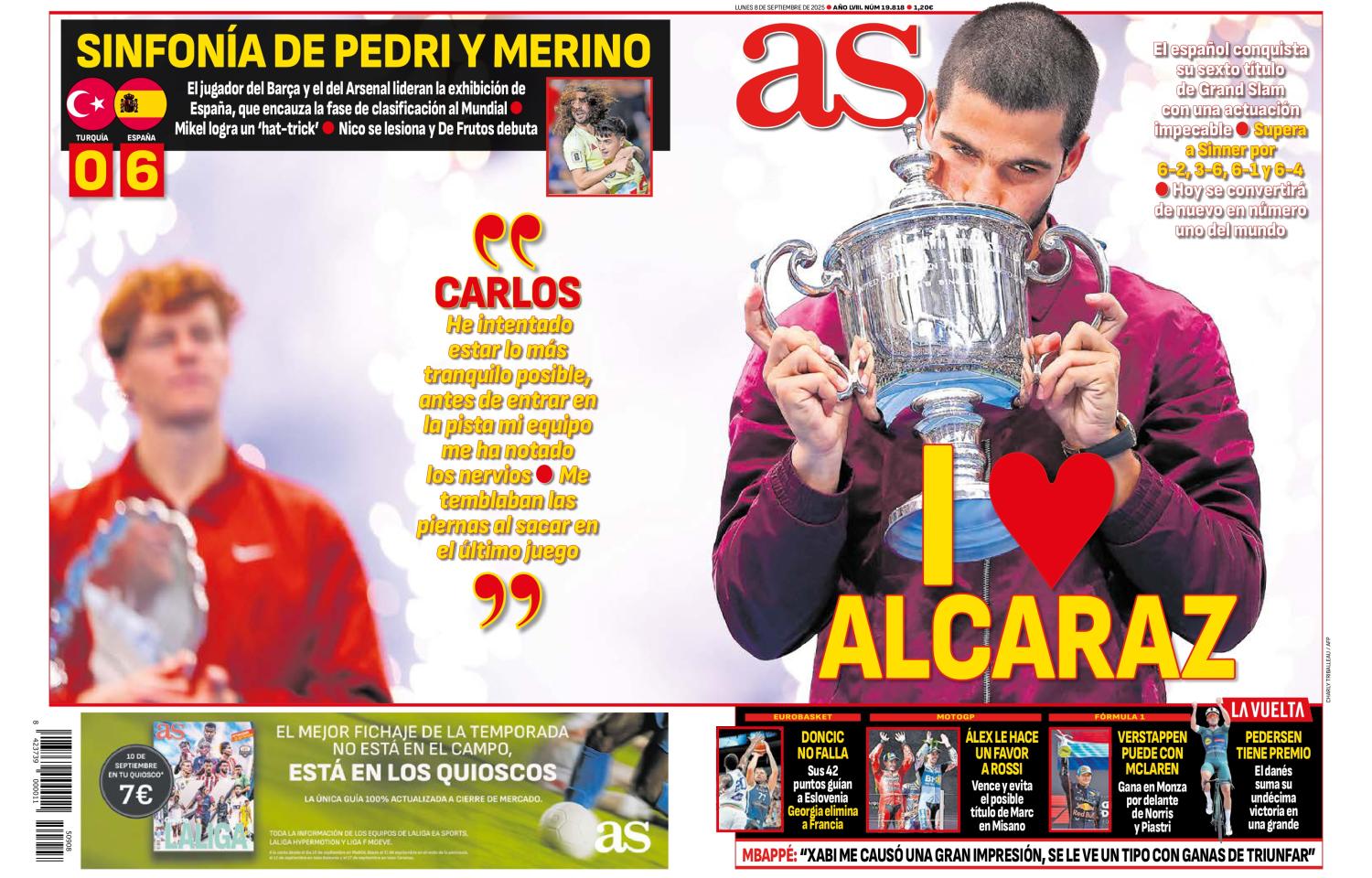 El diario AS destaca en su portada del lunes 8 de septiembre la victoria de Carlos Alcaraz sobre Jack Sinner en el US Open, lo que supone su sexto Grand Slam tras una actuación impecable. Además, se convertirá en el número uno del mundo.