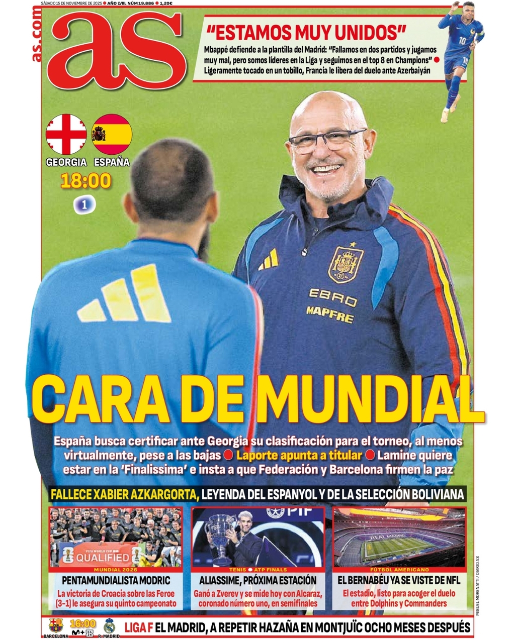 El AS saca en primera plana para este sábado la defensa de Kylian Mbappé al Real Madrid en rueda de prensa con Francia ante las últimas informaciones sobre el club blanco: "Estamos muy unidos"