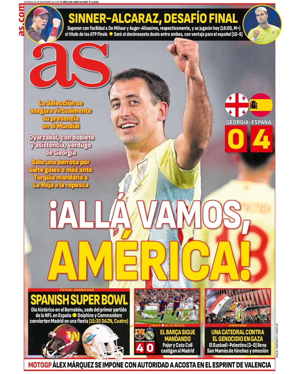 El diario AS destaca en su portada del domingo la clasificación virtual de España tras ganar a Georgia por un contundente 0-4, además del enfrentamiento entre Dolphins y Commanders en el primer partido histórico de la NFL en el Estadio Santiago Bernabéu.