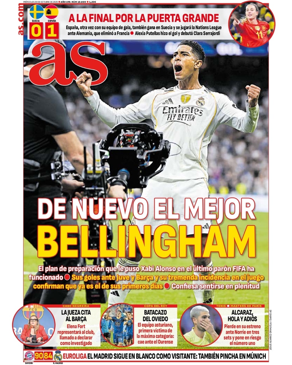El diario AS saca en primera plana para este miércoles 29 de octubre la vuelta del mejor Jude Bellingham, que lleva dos partidos consecutivos marcando y fue clave para vencer al Barcelona el pasado domingo en el clásico.