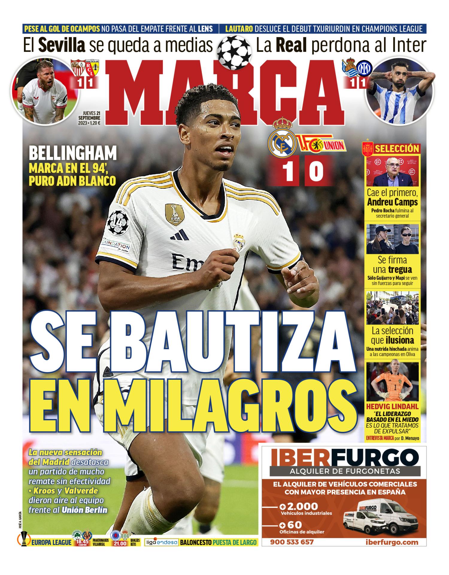 Bellingham y el Real Madrid, protagonistas en las portadas deportivas del 21 de septiembre.
