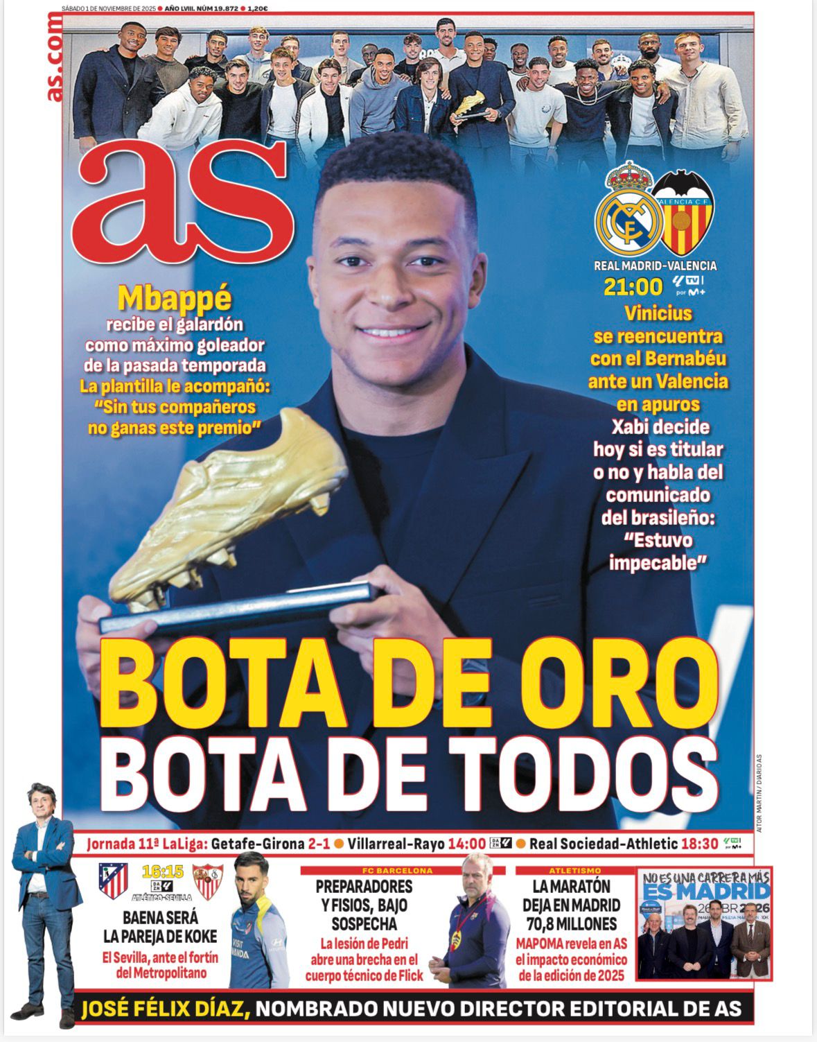 El diario AS saca en primera plana la Bota de Oro de Kylian Mbappé, que la recibió acompañado del resto de sus compañeros. También destaca la previa del Real Madrid - Valencia con Vinicius Jr como protagonista.