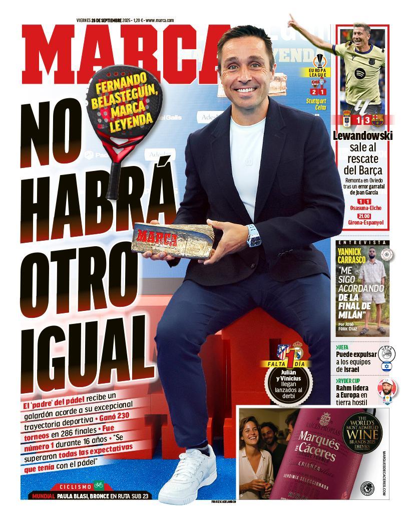 En su portada para este viernes 26 de septiembre de 2025, el diario Marca saca una entrevista exclusiva con Fernando Belasteguín y otra con Yannick Carrasco.