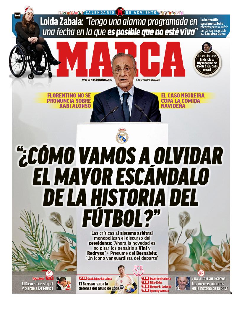 El diario Marca saca para este martes las declaraciones de Florentino Pérez en la comida navideña del Real Madrid con los medios de comunicación. "¿Cómo vamos a olvidar el mayor escándalo de la historia del fútbol?", se ha pronunciado el presidente del club blanco.