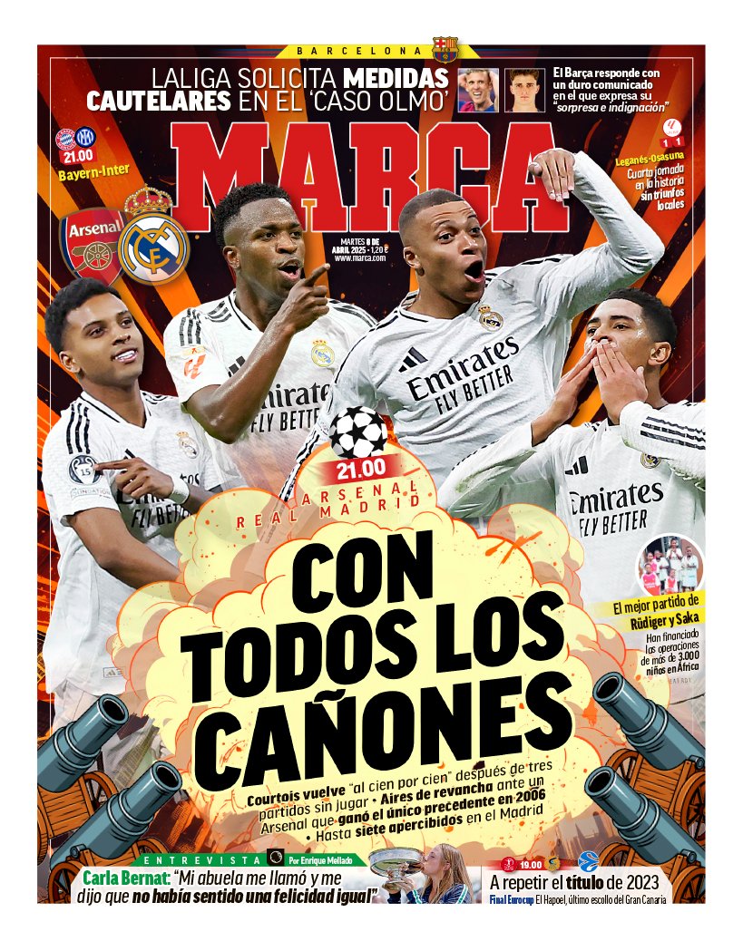 El diario Marca destaca en su primera plana la previa del partido de la UEFA Champions League entre el Arsenal y el Real Madrid que se jugará esta misma noche en el Emirates Stadium.