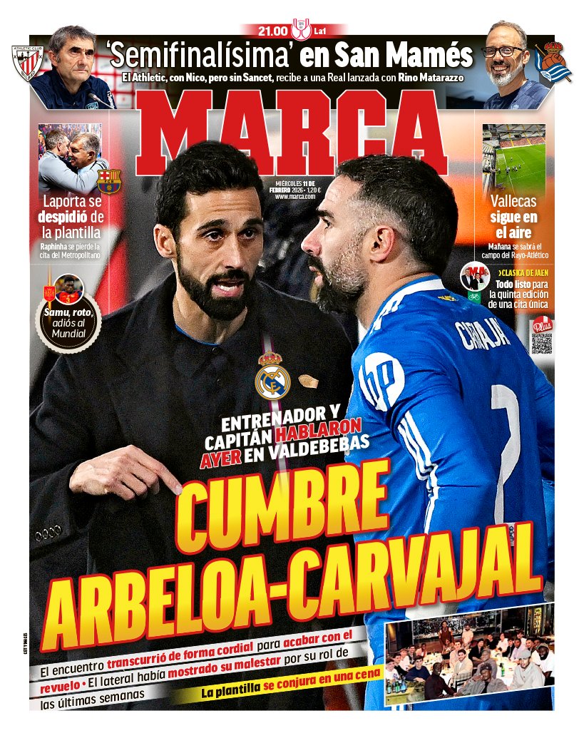 En el diario Marca destacan la "cumbre Arbeloa-Carvajal", ya que hablaron ayer en Valdebebas para sopesar la situación del capitán del Real Madrid. Además, "la plantilla se conjura en una cena".