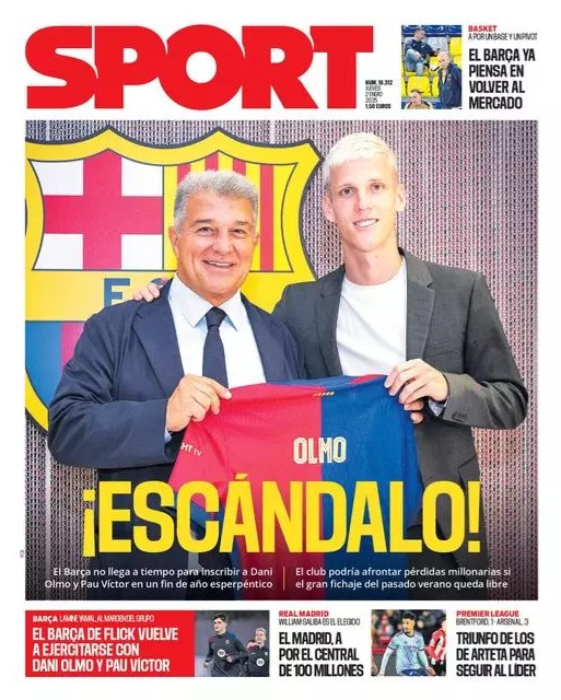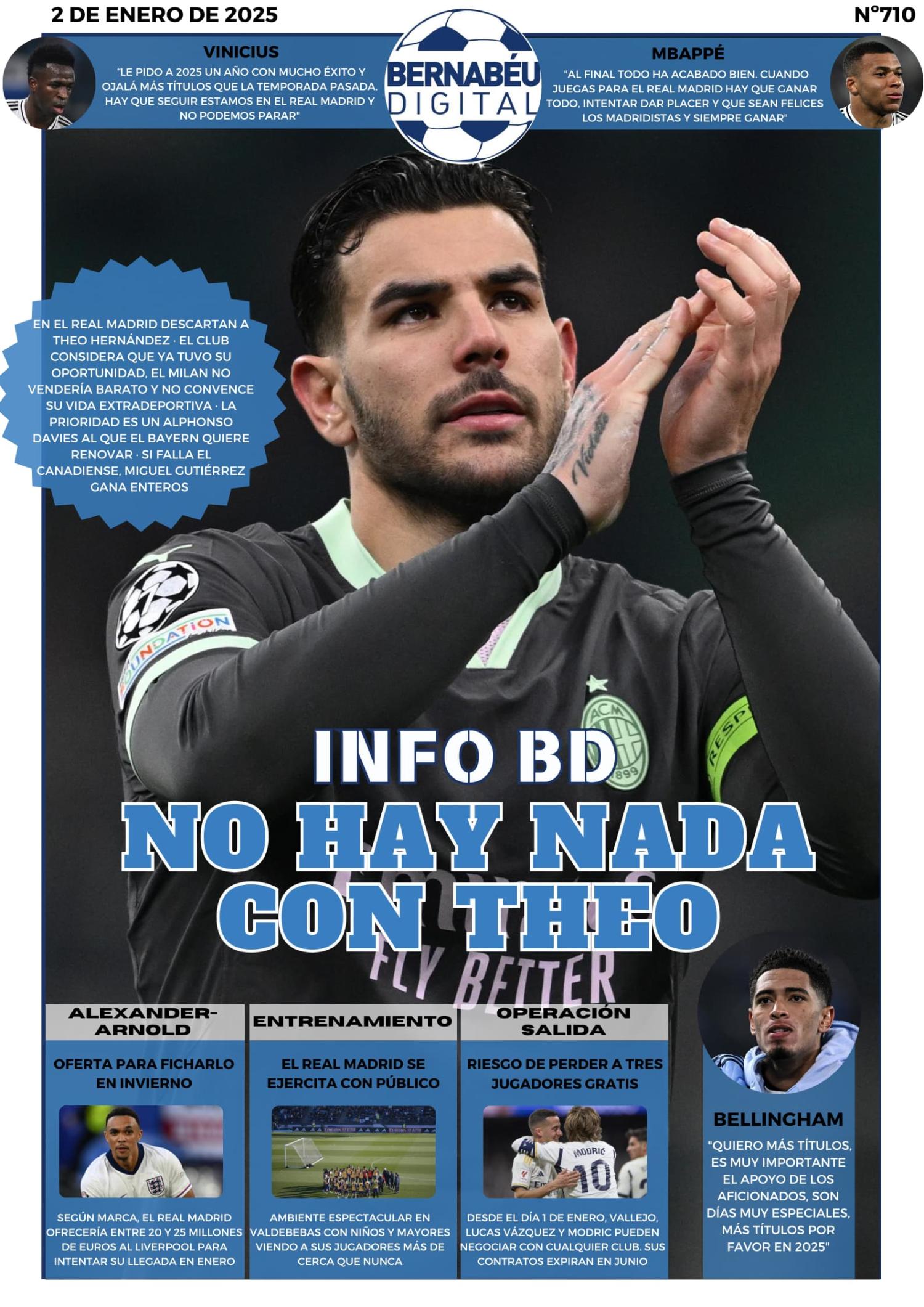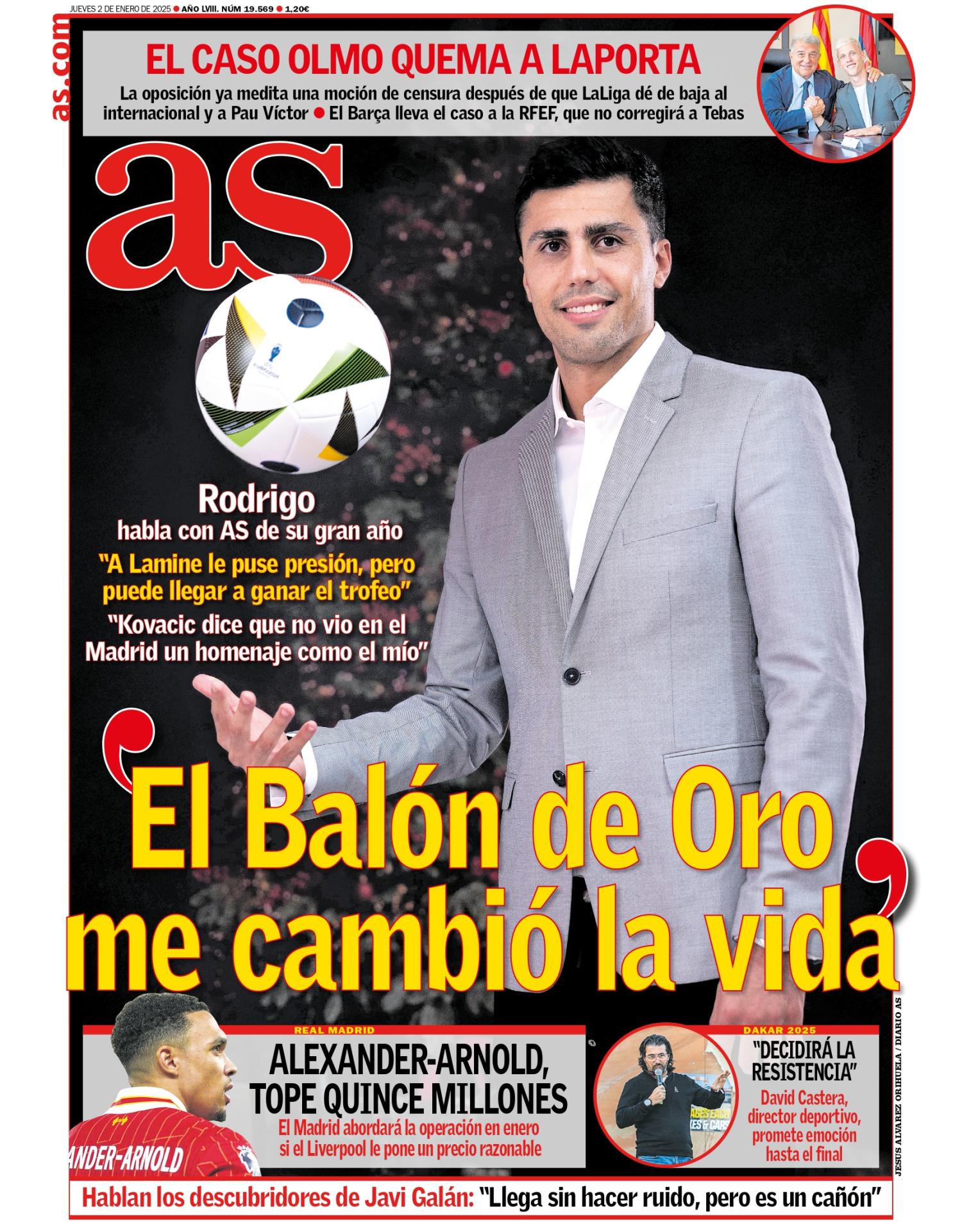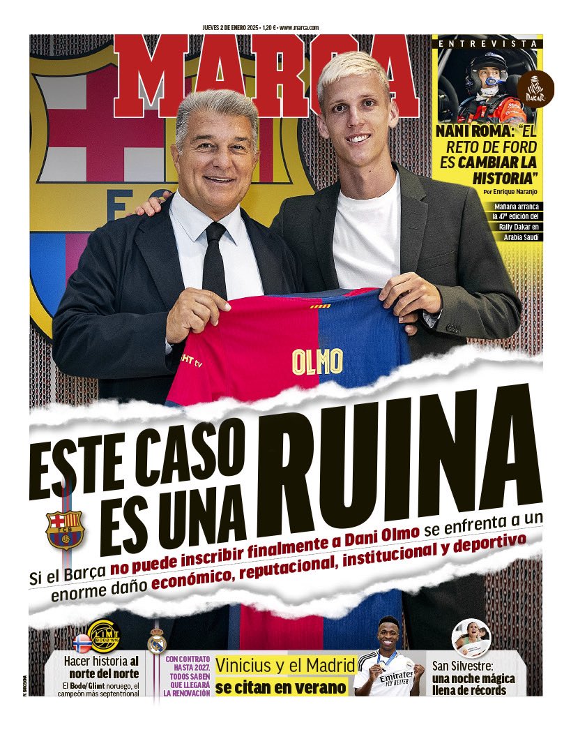 Este jueves 2 de enero de 2025, las portadas deportivas se centran en varios temas. En primer lugar, Marca destaca el escándalo de un FC Barcelona que, finalmente, no pudo inscribir a Dani Olmo, y el estado de la renovación de Vinicius Junior con el Real Madrid. Asimismo, el diario as saca una entrevista con Rodri, quien afirma que el Balón de Oro le ha cambiado la vida, y desvela también el tope de 15 millones de euros que se ha marcado el Real Madrid para abordar el fichaje de Alexander-Arnold este mes. Por su parte, Sport califica de "escándalo" el caso Olmo, y en Bernabéu Digital mostramos en primera plana, la respuesta del club blanco a los rumores sobre Theo Hernández, entre otros temas.