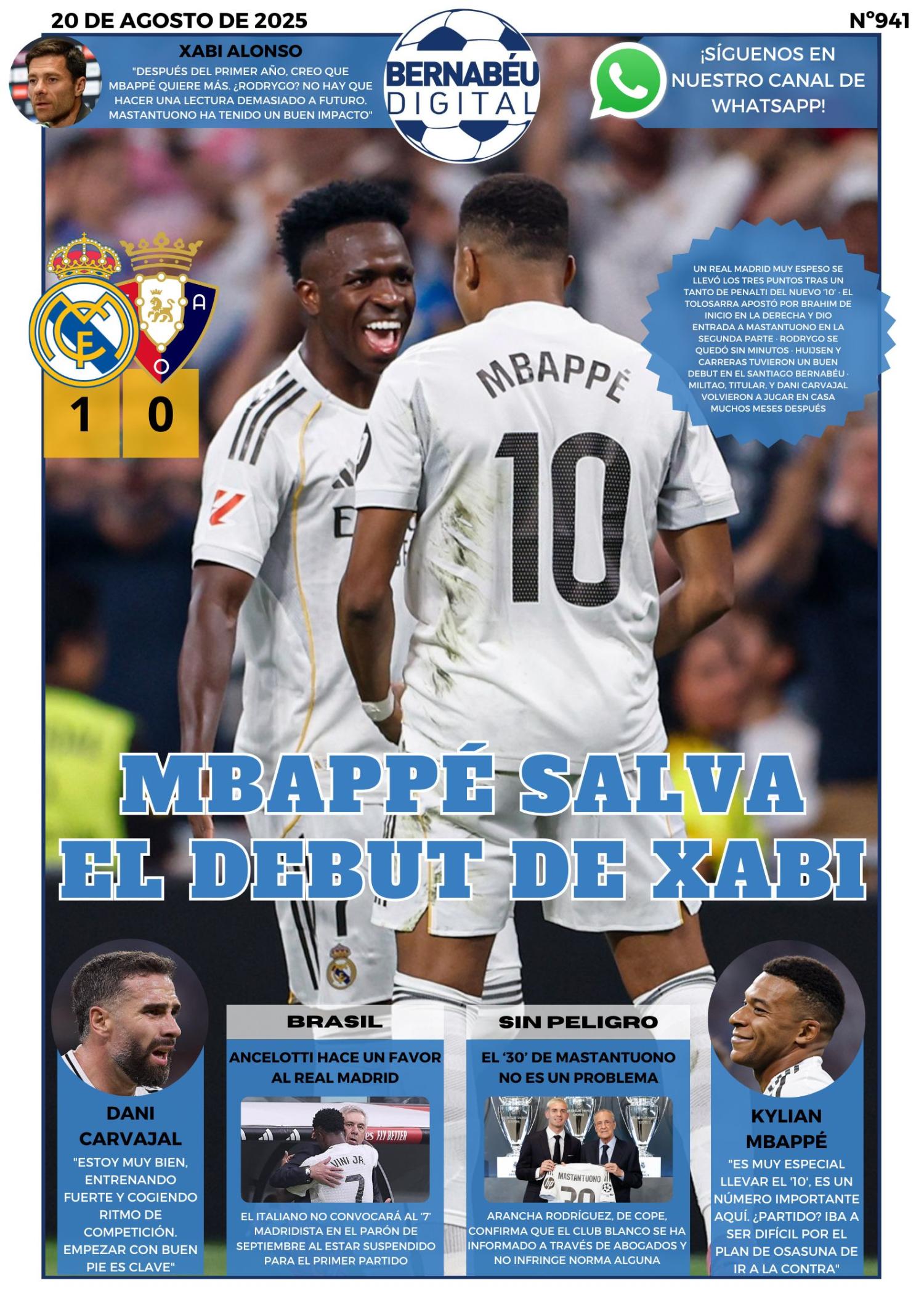 La Portada BD de hoy destaca la victoria del Real Madrid ante Osasuna en el debut liguero... y de Franco Mastantuono. Mbappé marcó el gol de la victoria.