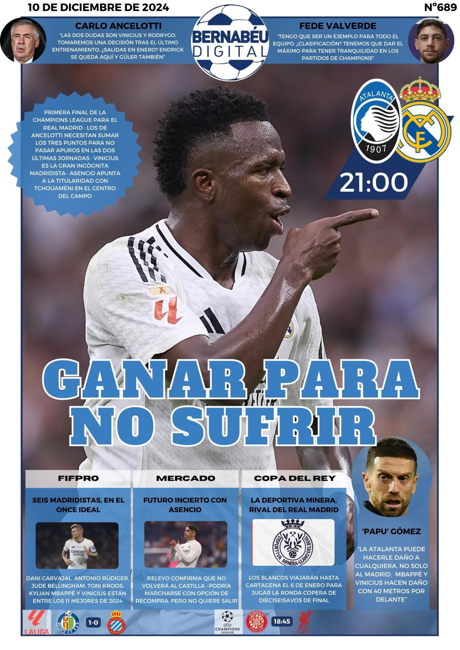 La portada de hoy de Bernabéu Digital presenta el partido entre la Atalanta y el Real Madrid de Champions League, un encuentro crucial en el que es obligatorio "ganar para no sufrir".