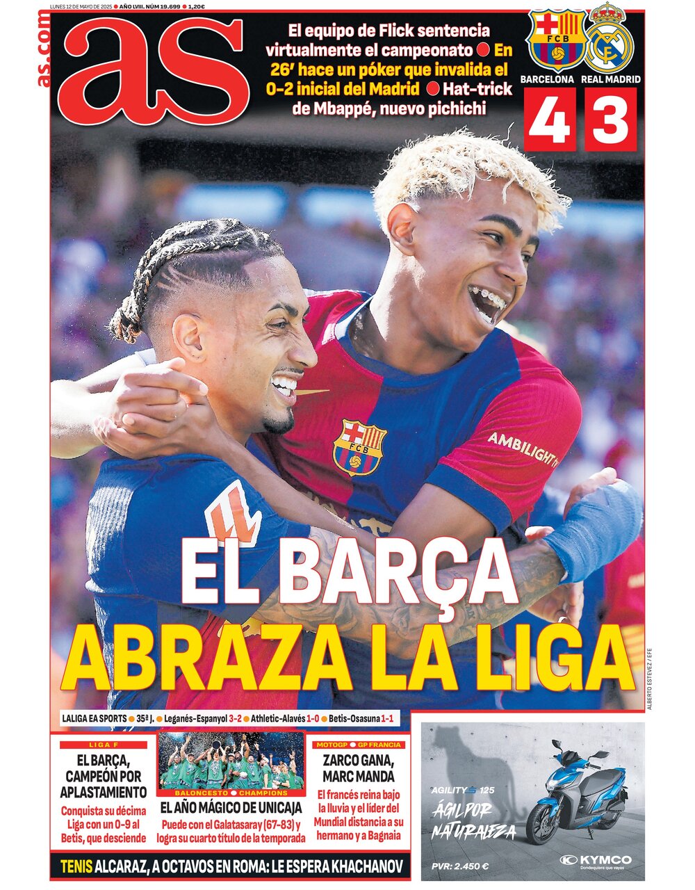 El diario as, en su portada para este lunes 12 de mayo de 2025, destaca la victoria del Barcelona en el clásico ante el Real Madrid. "El Barça abraza la liga" titula, destacando lo cerca que está el conjunto culé de hacerse con el campeonato doméstico.