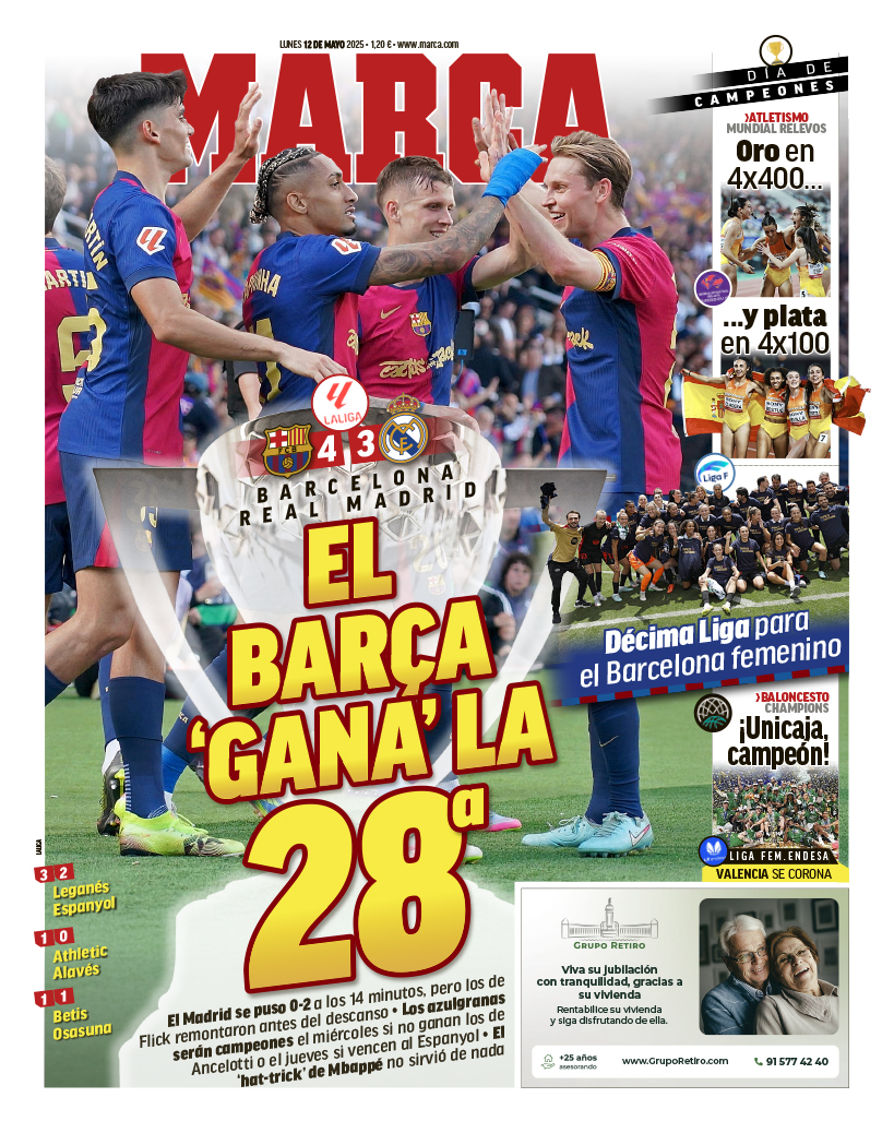 Este lunes 12 de mayo de 2025, el diario Marca saca en portada la victoria del Barcelona en el clásico ante el Real Madrid. "El Barça 'gana' la 28ª" titula, destacando lo cerca que está el conjunto culé de cantar el alirón.