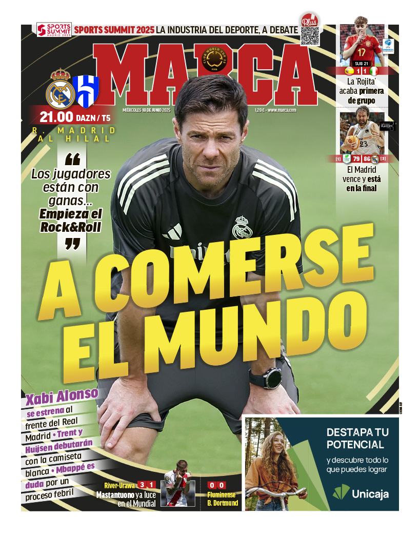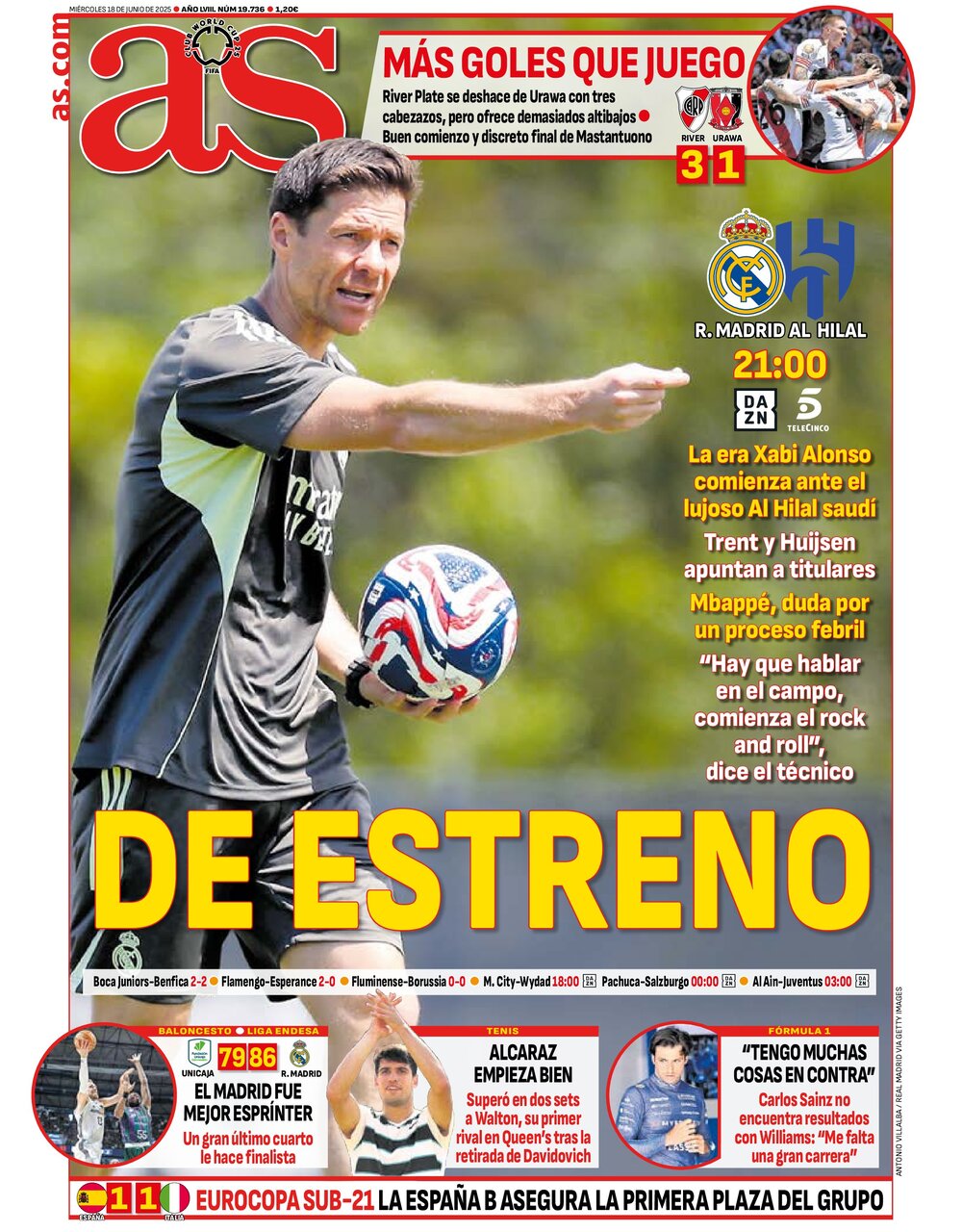 El estreno de Xabi Alonso como técnico del Real Madrid copa las portadas deportivas de este miércoles 18 de junio de 2025.