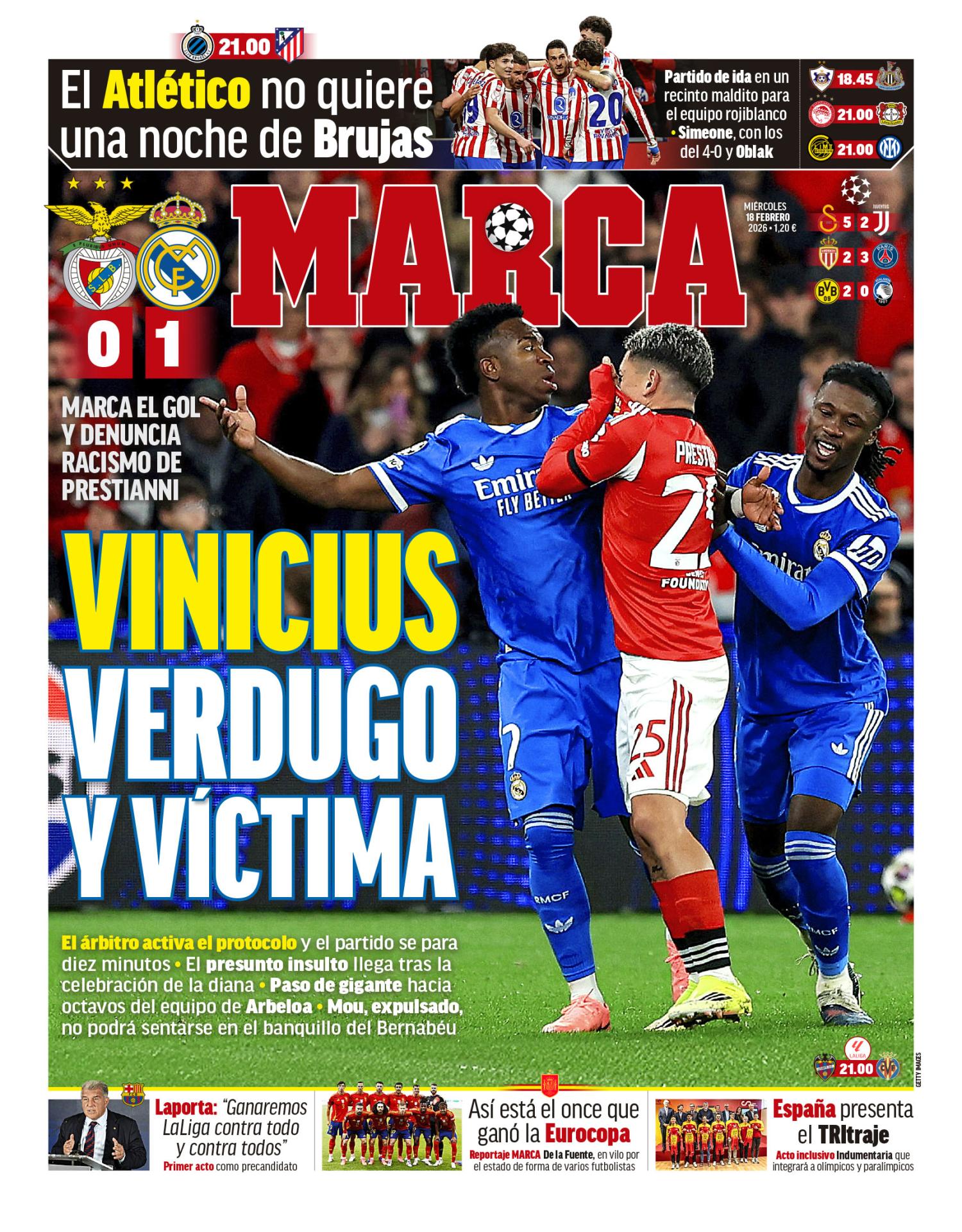 El diario Marca destaca en su portada el deleznable acto protagonizado por Gianluca Prestianni, donde presuntamente llamó "mono" a Vinicius Jr en la victoria del Real Madrid contra el Benfica.