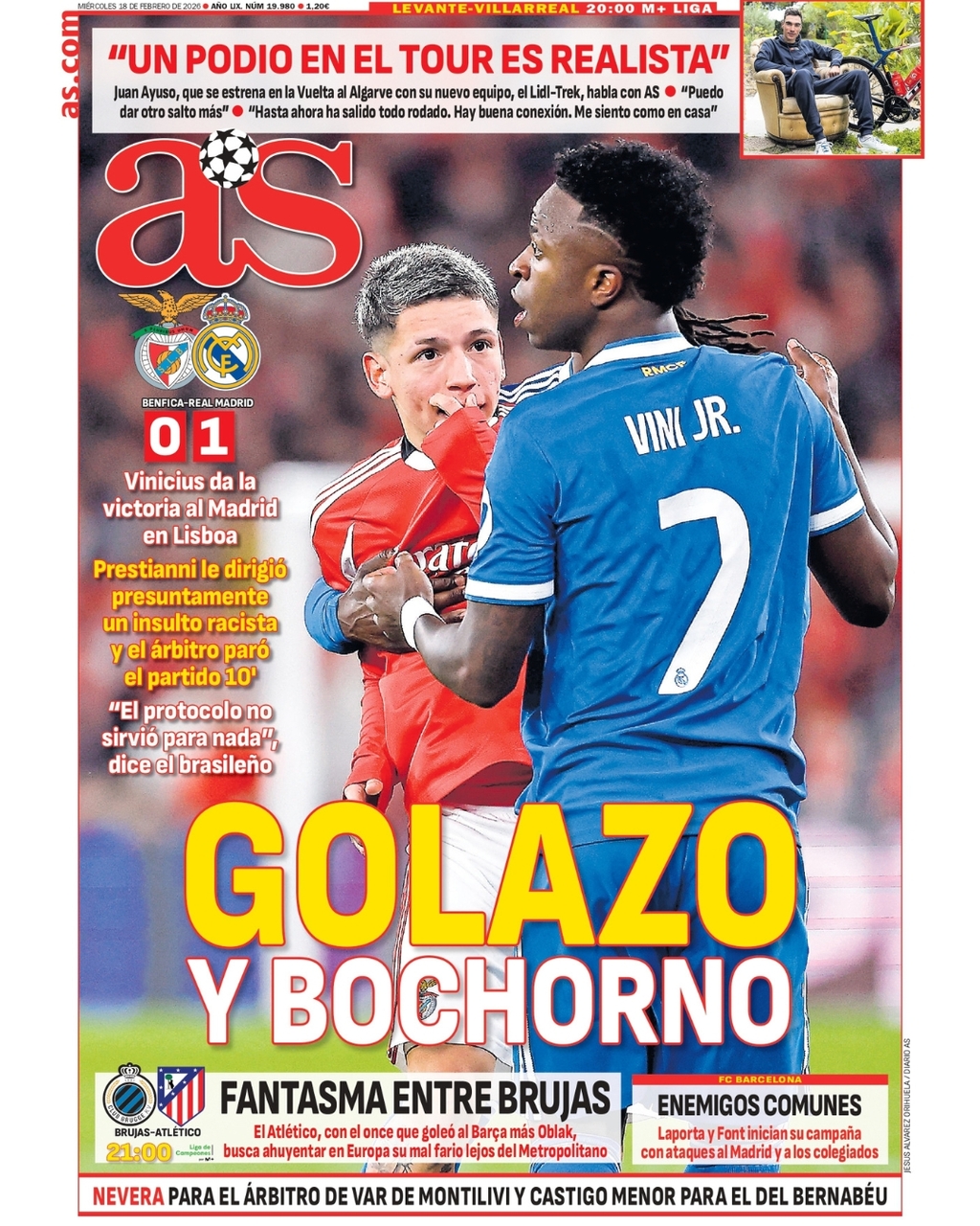 Por parte del diario AS, completa su primera plana con el presunto insulto racista de Prestianni, que tardará en olvidar el auténtico bochorno que ha protagonizado en la victoria del Real Madrid ante el Benfica en Champions.