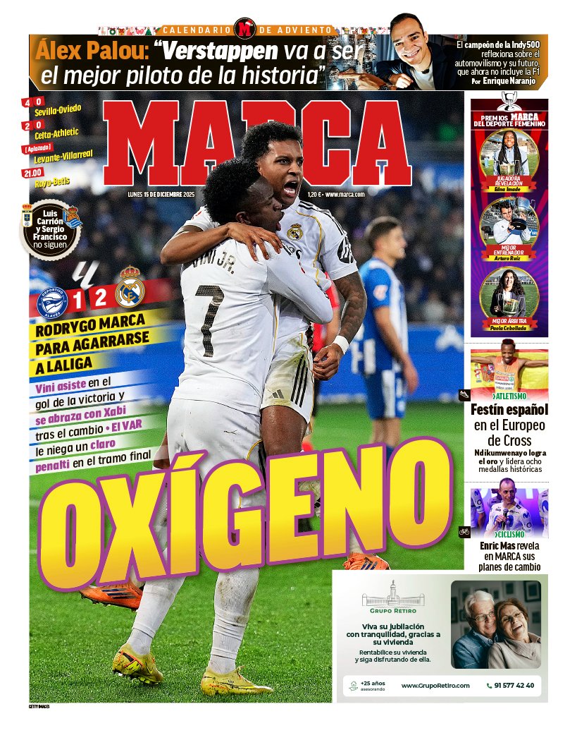 El diario Marca titula su portada de doy con "oxígeno", el que ha cogido el Real Madrid tras la victoria ante el Alavés.