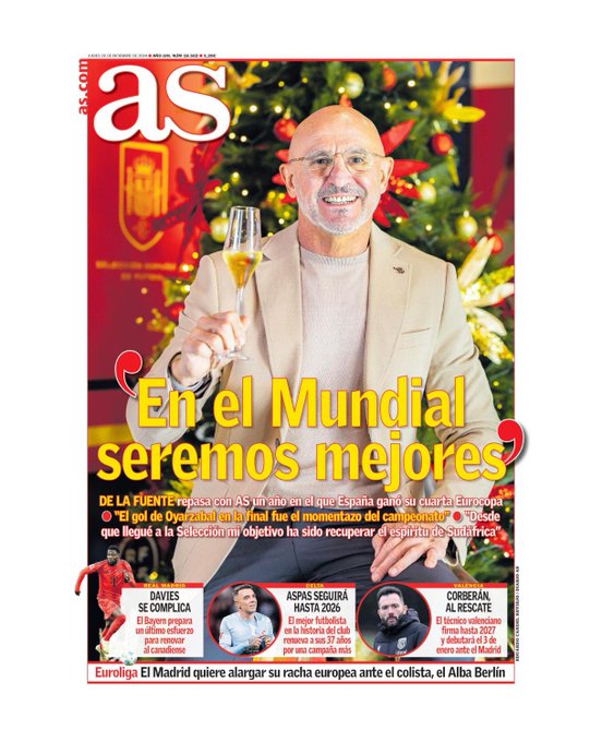 La portada del jueves del diario AS viene protagonizada por una entrevista con Luis de la Fuente. De igual forma, el periódico madrileño asegura que el fichaje de Alphonso Davies por el Real Madrid "se complica".