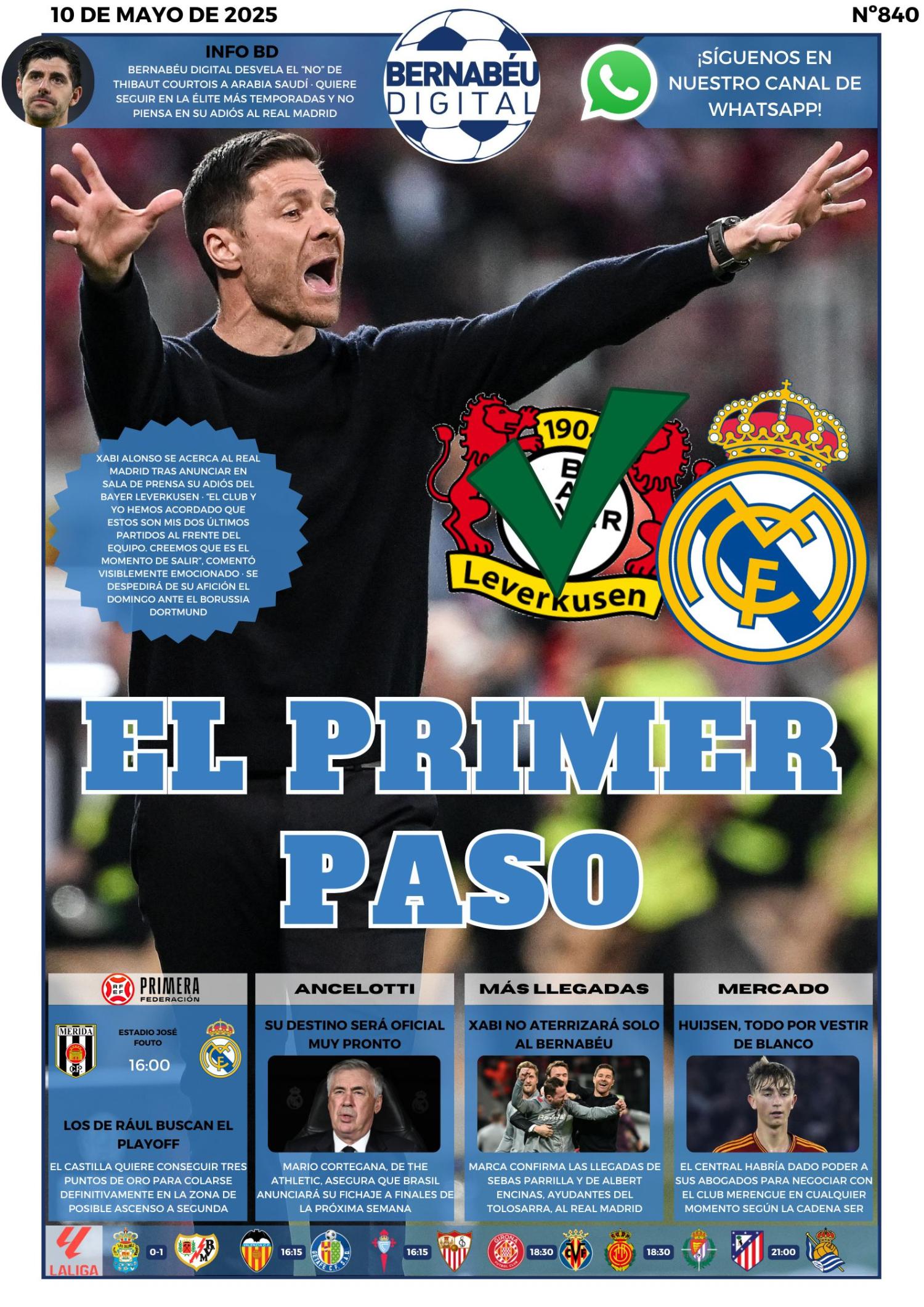 Bernabéu Digital destaca en su portada del sábado 10 de mayo la llegada de Xabi Alonso al Real Madrid tras el anuncio en rueda de prensa de su salida del Bayer Leverkusen, y es que es un paso más que da el tolosarra en esta dirección. También la decisión de Dean Huijsen de fichar por el club blanco, así como el futuro adiós de Carlo Ancelotti.