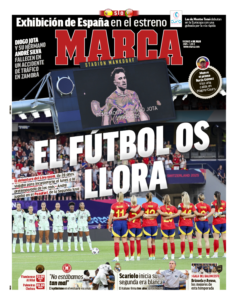 El diario Marca, en su portada para este viernes 4 de julio de 2025, destaca el fallecimiento de Diogo Jota y de su hermano André, que ha conmocionado el mundo del fútbol. Asimismo, resalta la victoria de la selección española femenina ante Portugal y el fichaje de Sergio Scariolo por el Real Madrid de baloncesto.
