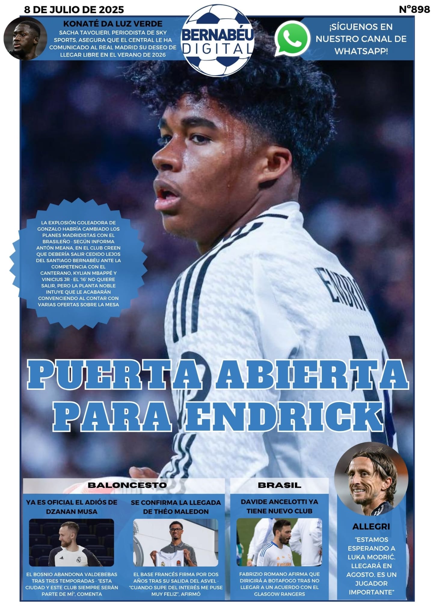 En la portada del martes 8 de julio, en Bernabéu Digital destacamos la posible salida de Endrick en forma de cesión. El brasileño podría ser la víctima tras la explosión de Gonzalo en el Mundial de Clubes. Además, Konaté le habría confirmado al Real Madrid su intención de recalar en el club de Concha Espina a coste cero en el verano de 2026.