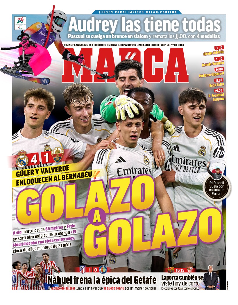 Marca destaca en su portada una foto de todo el equipo, entre ellos varios canteranos felicitando a su compañero por el absoluto golazo que marcó Arda Güler desde casi 70 metros.