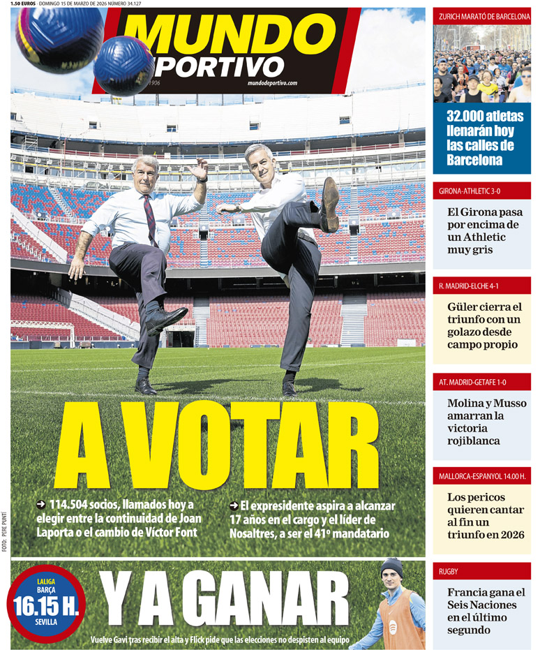 Por último, El Mundo Deportivo hace hincapié en su primera página en esas anteriormente citadas elecciones que se recalcan en todos los periódicos deportivos de Barcelona poniendo como principales protagonistas en su foto a Joan Laporta y Victor Font.