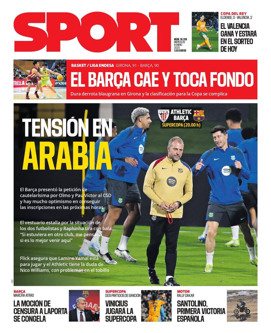 Este miércoles 8 de enero de 2025, las portadas deportivas se centran en la Supercopa de España que comenzará esta noche con el Barcelona - Athletic (20:00 horas / Movistar+).