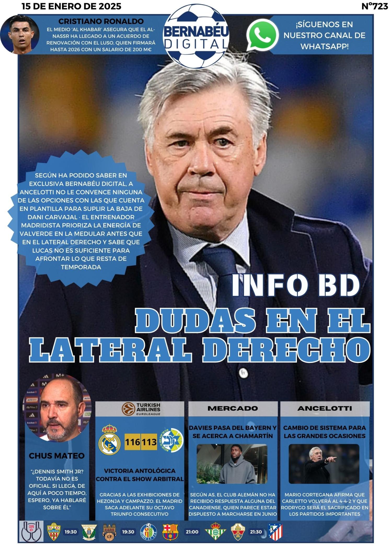 En Bernabéu Digital abrimos la portada del día 15 de enero con la última exclusiva sobre Carlo Ancelotti y la principal carencia del Real Madrid. El italiano parece haber encontrado el principal problema del equipo, que estaría en el lateral derecho. Lucas Vázquez juega fuera de posición, no habrá fichajes y Fede Valverde no convence porque dejaría huérfano el centro del campo.