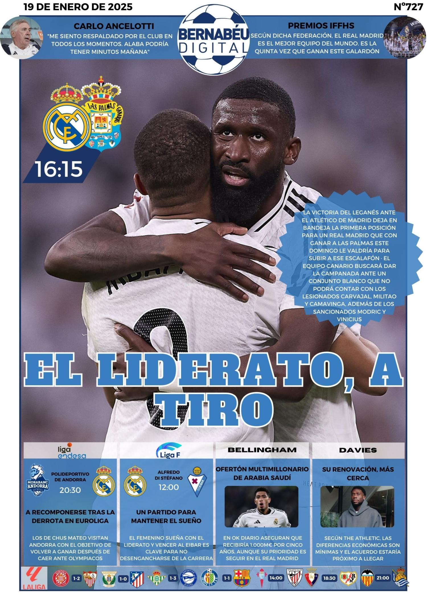 En Bernabéu Digital abrimos con el liderato a tiro que tiene el Real Madrid si vence a la Unión Deportiva Las Palmas, tras el pinchazo del Atlético de Madrid. La oferta multimillonaria de Arabia a Bellingham y la renovación de Davies con el Bayern también son protagonistas.
