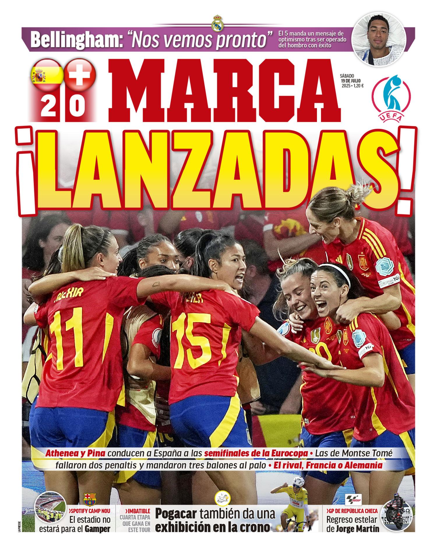El diario Marca destaca en su portada la operación de Jude Bellingham, que estará de baja hasta cuatro meses por la lesión de hombro que lleva arrastrando todo el año. También saca en primera plana la clasificación de la selección española femenina a cuartos de final de la Eurocopa.