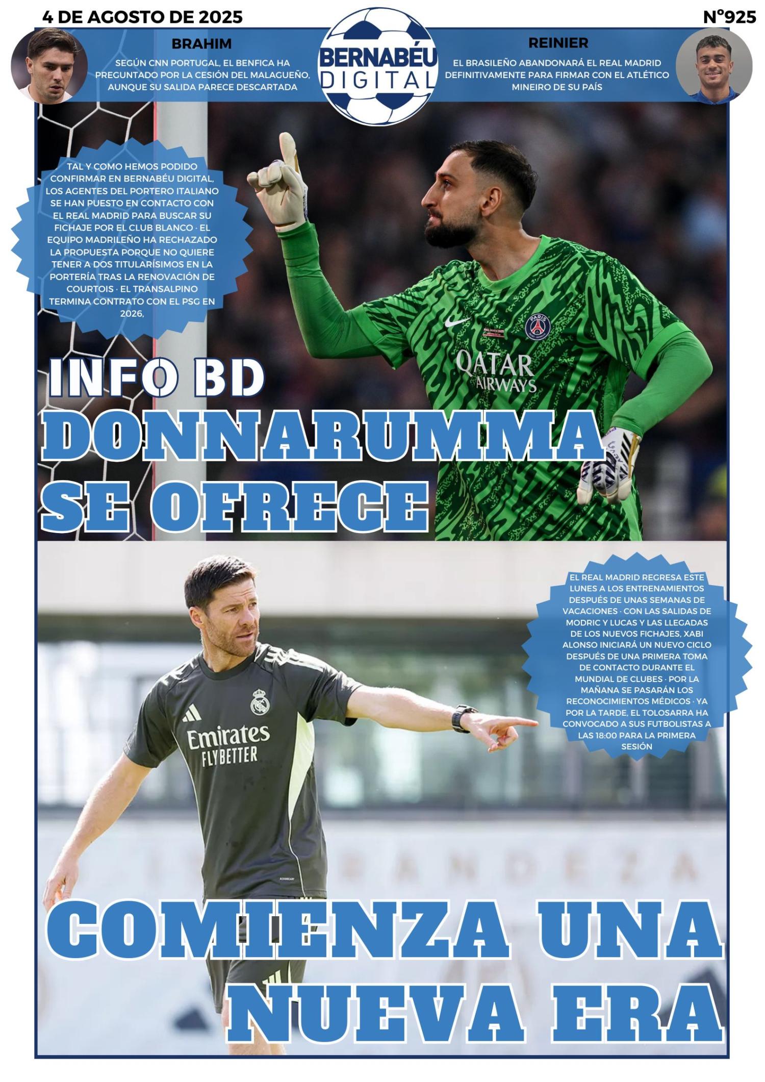 En nuestra edición del lunes 4 de agosto de 2025, en Bernabéu Digital hemos decidido abrir con la última INFO BD sobre el ofrecimiento de Donnarumma al Real Madrid. También con el regreso del club blanco a los entrenamientos, el interés en Brahim y la salida de Reinier.