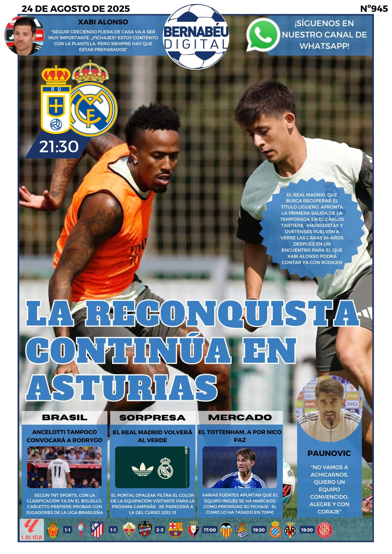 Para este domingo 24 de agosto, Bernabéu Digital destaca en su portada la previa del partido entre el Real Oviedo y el Real Madrid que se jugará a las 21:30.
