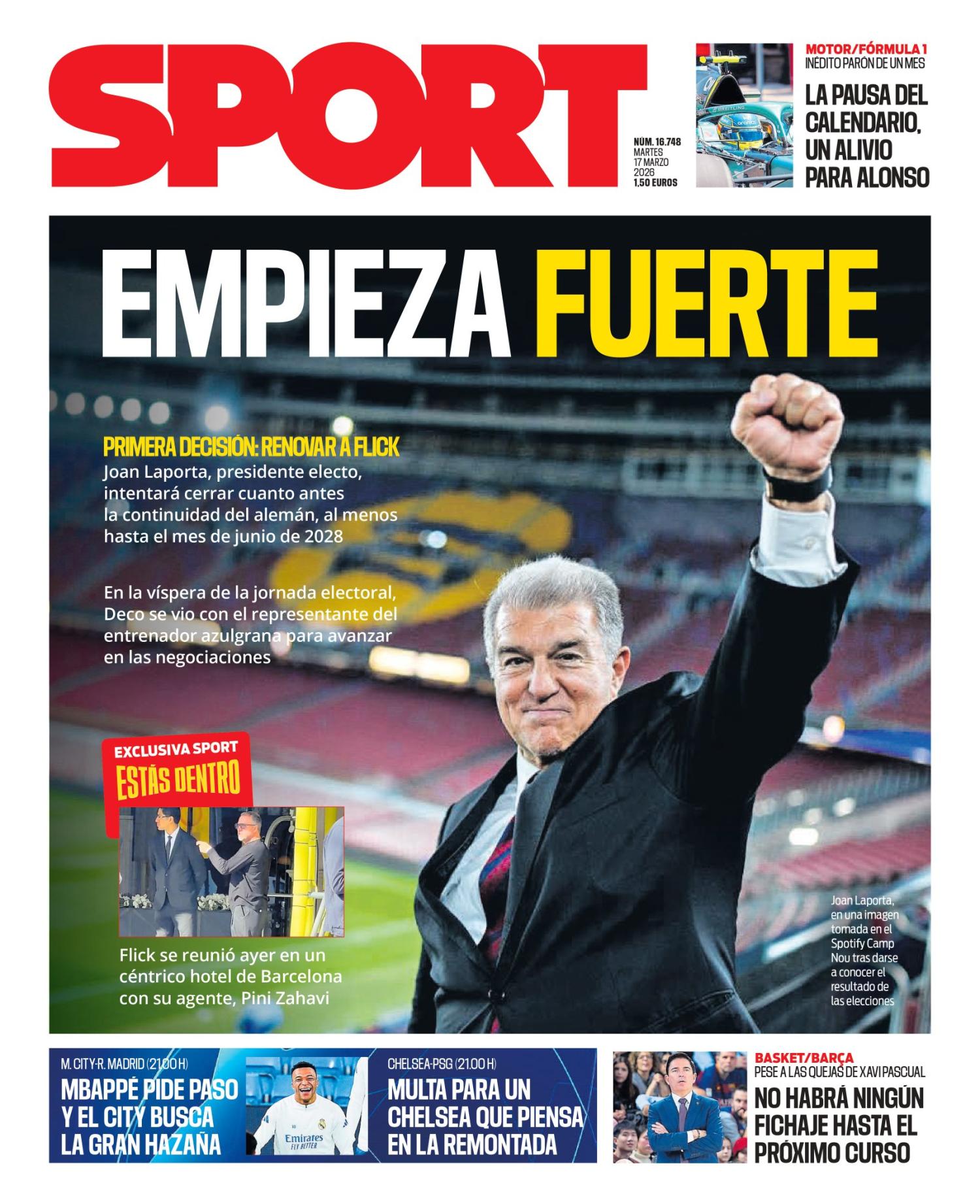 Sport pone como principal protagonista a Joan Laporta, quien habría tomado las primeras decisiones de su nuevo mandato y estaría en negociaciones para renovar a Hansi Flick para continuar como entrenador del Barça.