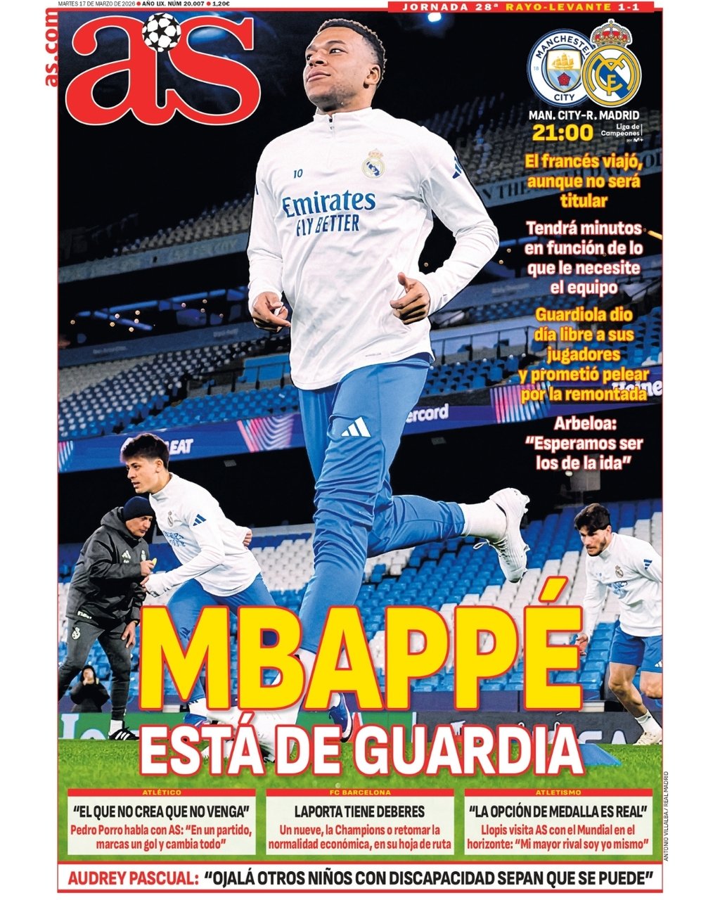 Por parte del AS, el diario saca en primera plana a Mbappé durante el entrenamiento de ayer en el Eithad Stadium, dodne se recalca que el francés estaría listo para tener minutos.