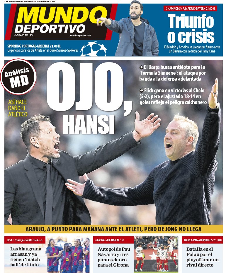 El Mundo Deportivo hace hincapié en primera página en los entrenadores del Atlético de Madrid y FC Barcelona quienes tienen la tarea de leer la táctica de su respectivo rival para no sufrir una derrota en el primer partido de ida de cuartos que les enfrenta esta semana.