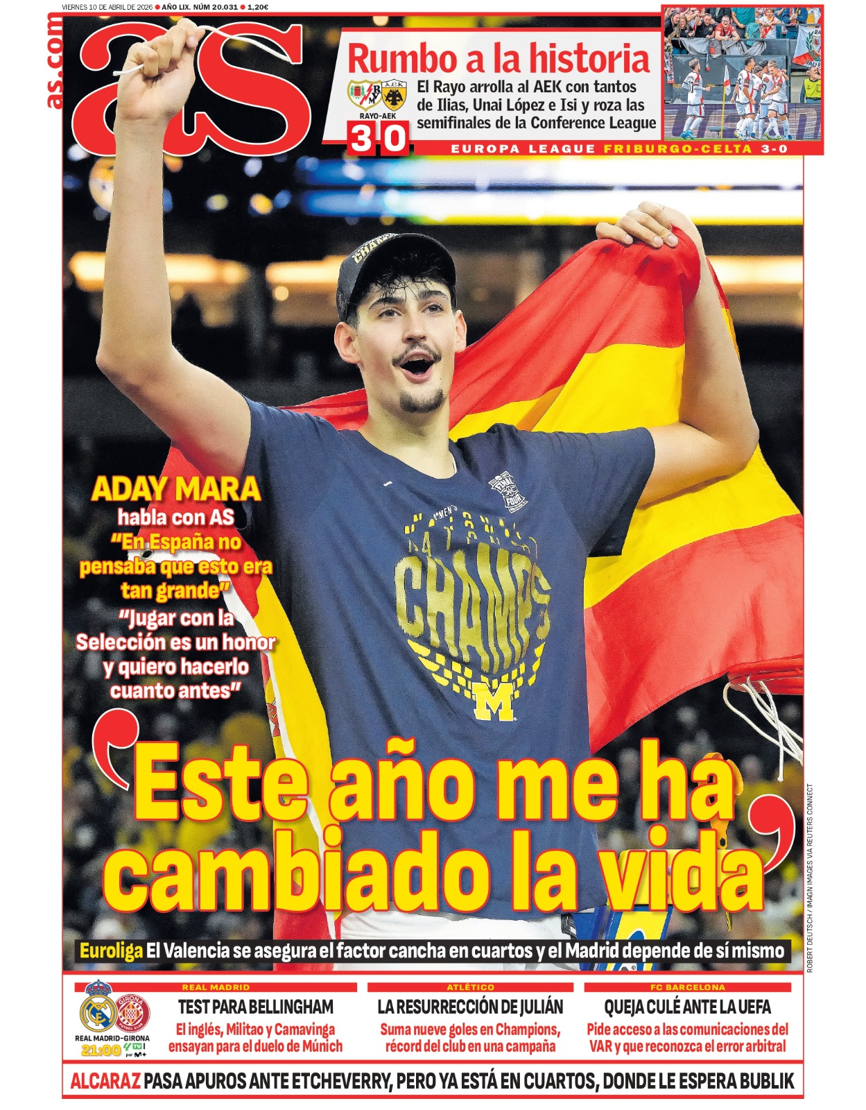 Por parte del AS, el diario saca en primera plana unas declaraciones de Aday Mara por su convocatoria con la selección española de baloncesto, jugador del Michigan Wolverines que participa en la liga NCAA de baloncesto universitario en Estados Unidos.
