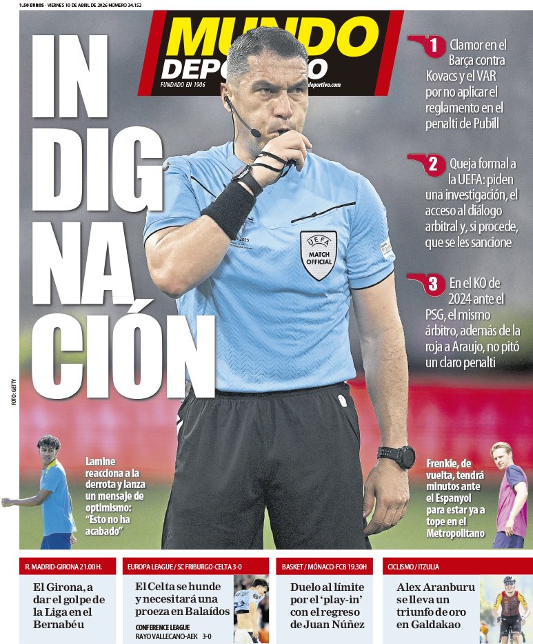 El Mundo Deportivo hace hincapié en primera página en la queja formal que se ha presentado frente a la UEFA donde exige que se abra una investigación hacia Kovacs y el VAR que actuó en el partido de Champions entre el FC Barcelona y el Atlético de Madrid.