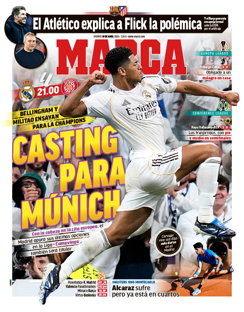 Marca destaca en su portada a Jude Bellingham como posible titular hoy frente al Girona en liga para hacer méritos de cara al importante partido del próximo miércoles contra el Bayern Munich en Champions League.