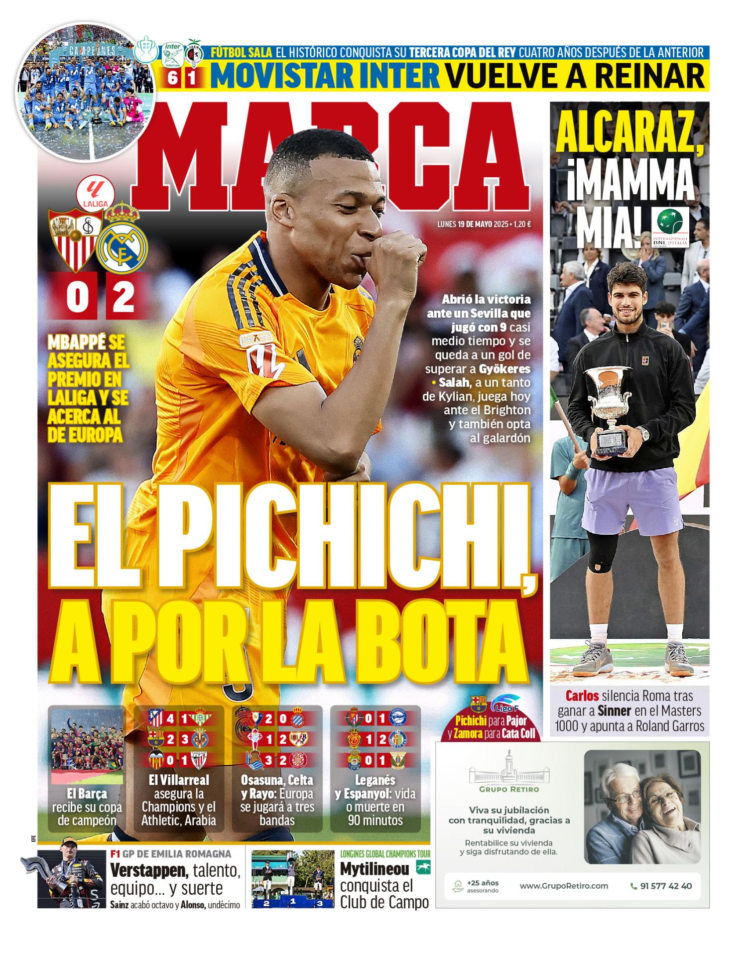 El diario Marca, en su portada para este lunes 19 de mayo de 2025, destaca a Kylian Mbappé, quien ya roza el Pichichi y apunta a hacerse también con la Bota de Oro.