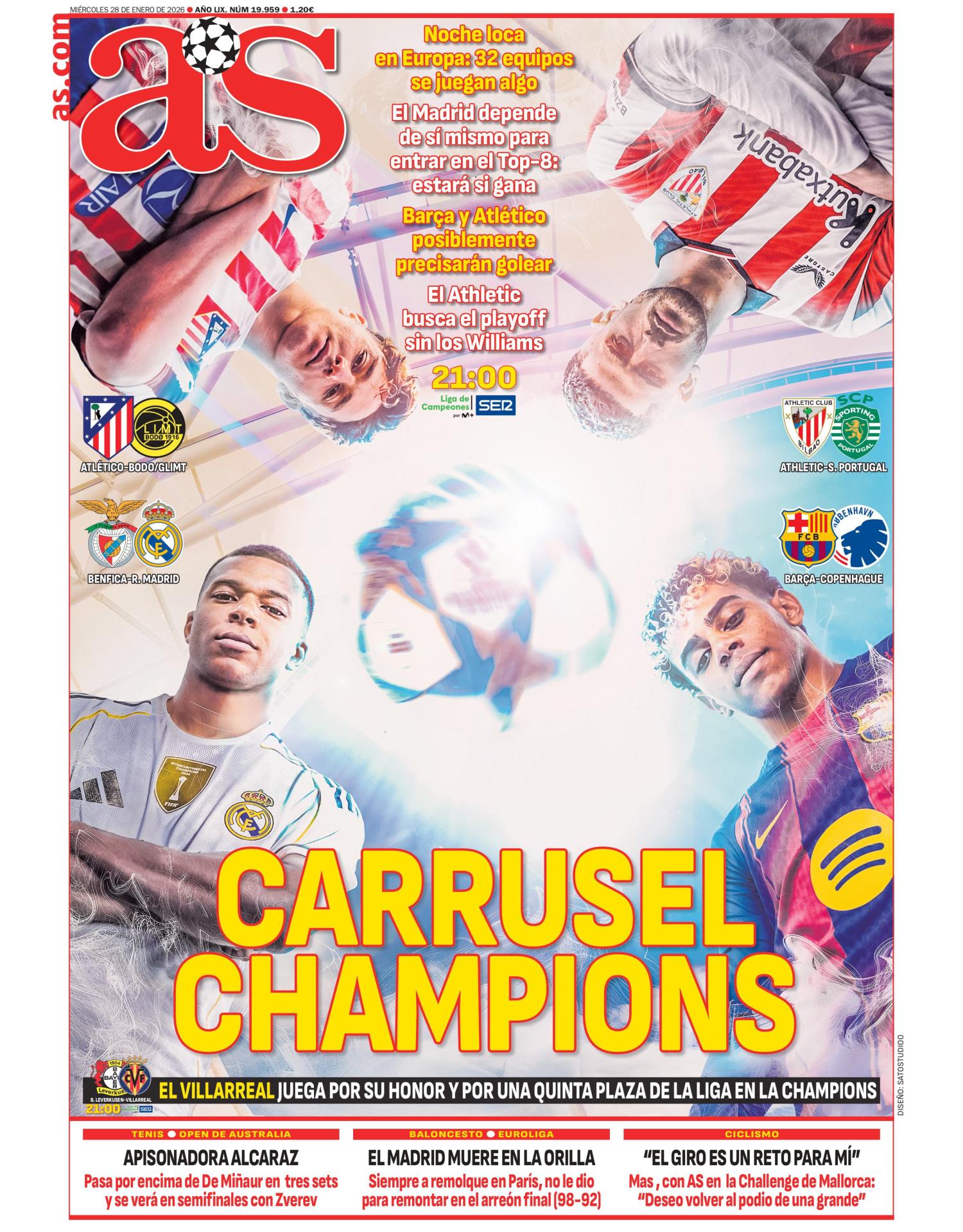 Las portadas de hoy abren con la última jornada de la fase de clasificación de la UEFA Champions League. El Real Madrid se reencuentra con José Mourinho en el encuentro ante el Benfica. En el diario AS destacan que "el Madrid depende de sí mismo para entrar en el top 8: estará si gana".